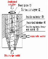 There is a slight slope at the bottom part of the inside cylinder to gain lifting force.Therefore, liquid solution (smaller specific gravity) is driven up to the top discharge. | |