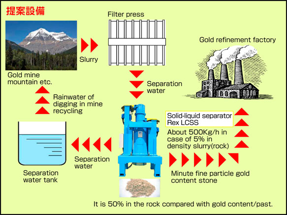 | The gold collection plant in the mine dehydrates from the gold content rock by high-pressure water with digging crushing doing and the filter press and is carried to the smelting place. Because the minute powder gold of the macro size flows out to the river by the distance with the filter press, it is a proposal of the thing to collect the minute powder gold. |